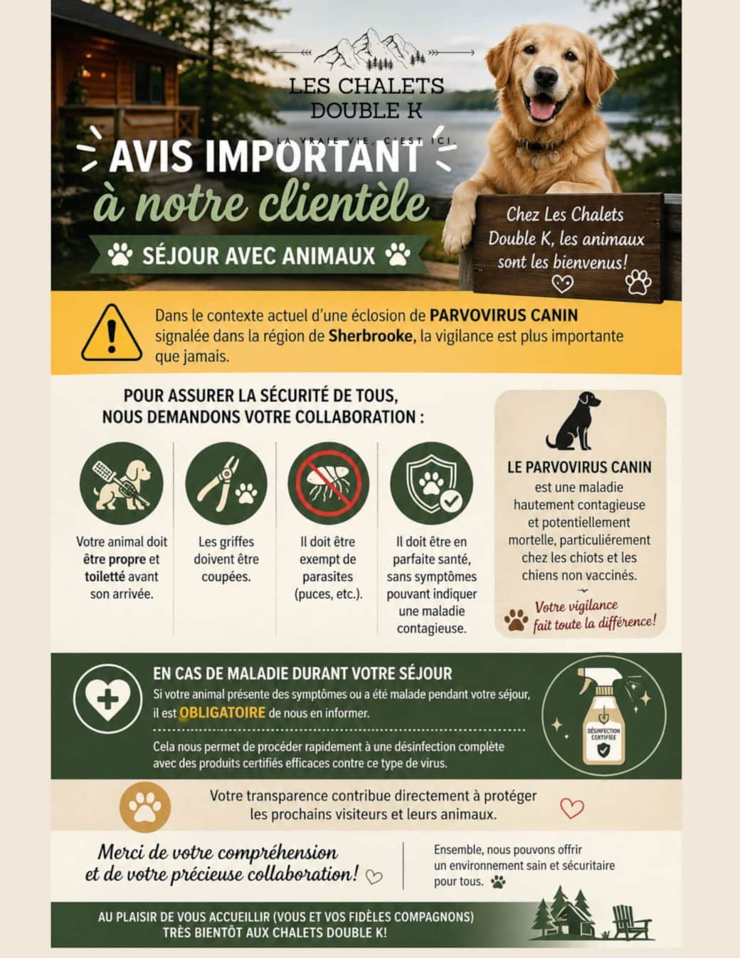 Dans le contexte actuel d’une éclosion de parvovirus canin signalée dans la région de Sherbrooke, nous souhaitons vous adresser un rappel important concernant l’accueil des animaux aux Chalets Double K.Nous sommes toujours aussi heureux d’accueillir vos compagnons à quatre pattes dans nos installations. Ils font partie de la famille, et leur présence est la bienvenue chez nous.